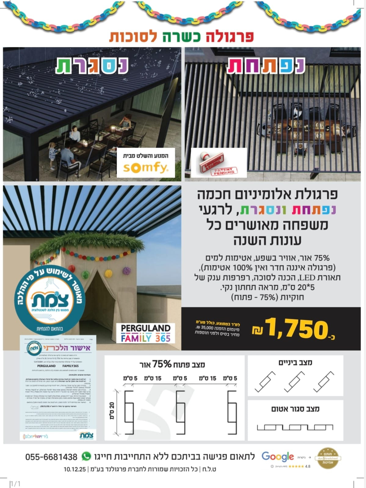 פרגולנד בע"מ, מאז 2012, חותם אמינות של D&B, כ 500 ביקורות גוגל, כוכב זהב ציון 4.8, כ 100 ביקורות זהב בEASY, ביטוח חבות מוצר, אחריות מוגבלת ל 10 שנים, ייצור ישראלי לחלוטין.