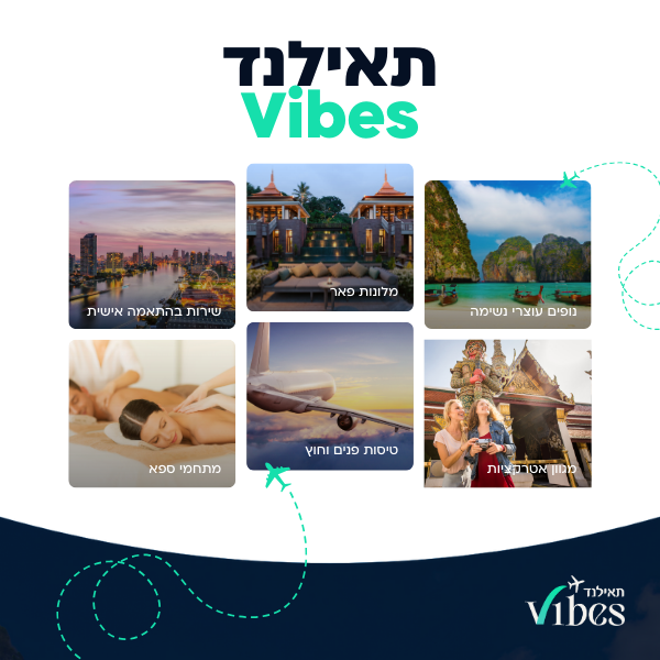 ברוכים הבאים ל-תאילנד Vibes, החברה המובילה ביצירת חוויות נופש יוקרתיות בתאילנד. אצלנו, כל חופשה נבנית בהתאמה אישית ובסטנדרט הגבוה ביותר, כדי להבטיח שאתם תקבלו את החוויה המושלמת, מהרגע הראשון ועד החזרה הביתה. יחד עם התכנון האישי לכל לקוח, יצרנו עבור חברי המועדון דילים ייחודיים שמעניקים חוויית נופש מקיפה במחירים בלעדיים. אנחנו כאן כדי לדאוג לכל פרט – מהטיסה, דרך המלון ועד האטרקציות, כך שהכול יזרום בצורה חלקה וללא דאגות. השירותים שלנו: