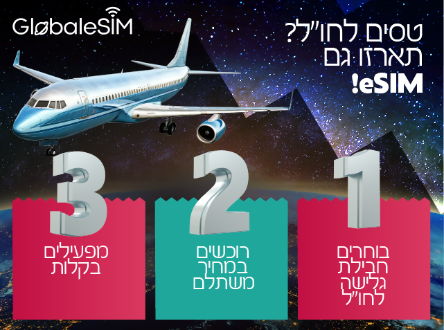 הפתרון המוביל לחבילות eSIM לחו"ל. מציעים מגוון רחב של חבילות מותאמות לישראלים, הפעלה קלה ומהירה תוך דקות, מחירים משתלמים במיוחד ושירות ותמיכה מלאה בעברית 24/7. הפתרון המושלם לגלישה בחו"ל.
