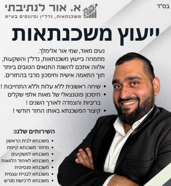 א. אור לנתיבתי – משכנתאות, נדל"ן ופיננסים בע"מ מספקת ליווי אישי וייעוץ פיננסי מקצועי לכל מי שמעוניין לקחת משכנתא, להשקיע בנדל"ן או לשפר את מצבו הכלכלי. עם ניסיון עשיר, חשיבה מחוץ לקופסה ונגישות לכל הגופים הפיננסיים – אנו נדאג שתשלמו פחות, תרוויחו יותר ותיהנו משקט נפשי. למה לבחור בנו?